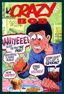 The Crazy Bob comic sold so poorly--both due to bad distribution and the proliferation of anatomically impossible superheroes--that no Bob strip had been created since their publication. Last year, and very briefly, Brian Bollom offered to host a Crazy bob website and I heartily agreed. I created the first new Bob cartoon in years, in the computer of all things. It's available, along with other clips, in the gallery that follows. Brians Crazy Bob site has since disappeared, but the work he encouraged lives on...